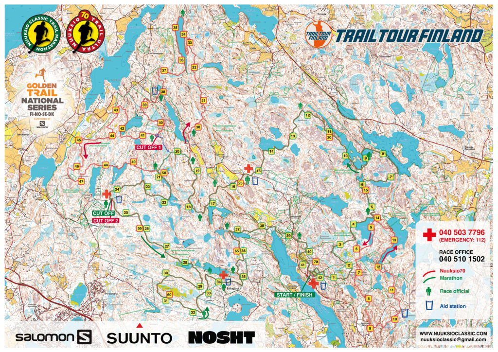 70km course has two extra loops from the marathon course. The actual course length is about 72km. Both have one additional water station that is available only for Nuuksio70 runners. There are two cut-offs: